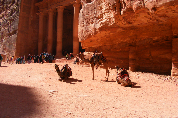View of more camels and the Treasury in the side of the rock